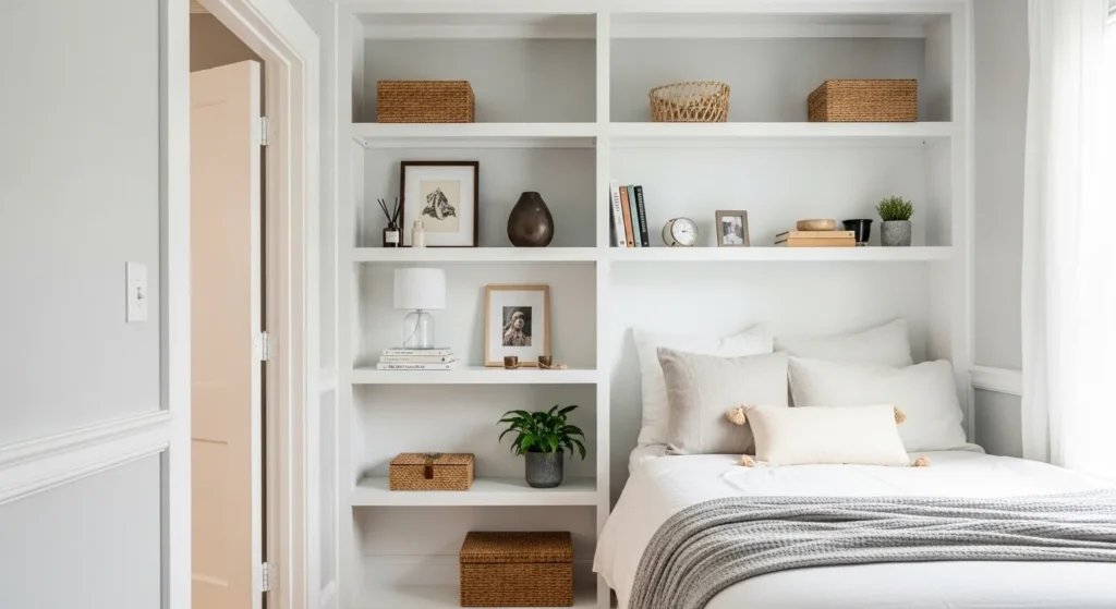 Choose shelving depths of 8-12 inches to avoid overwhelming the room. Paint shelves the same color as walls to create seamless integration that doesn’t visually fragment the space.