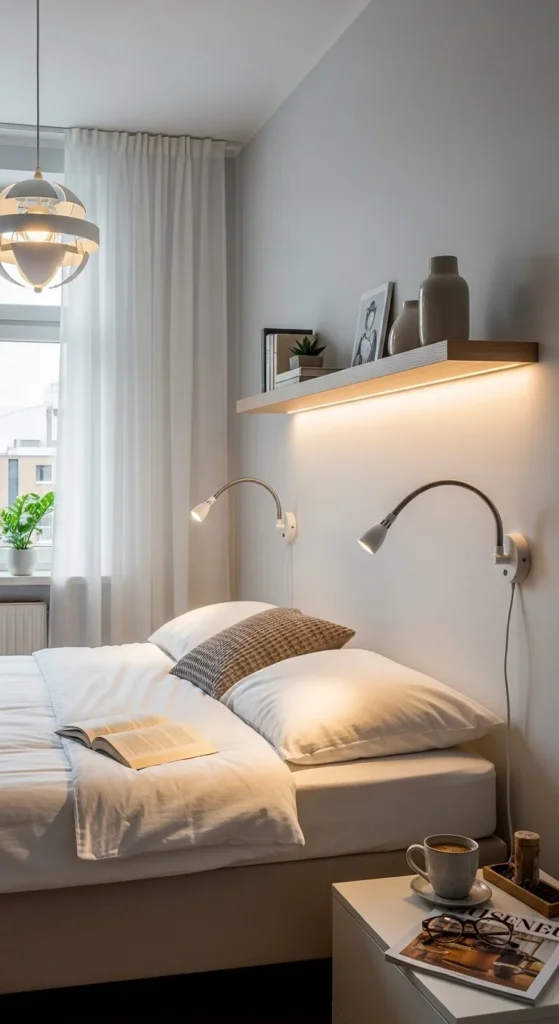 Install floating shelves 18-24 inches above your headboard to create a practical bedside storage area. This eliminates the need for bulky nightstands while providing space for books, plants, and personal items. Use shelves with hidden brackets for the cleanest look.