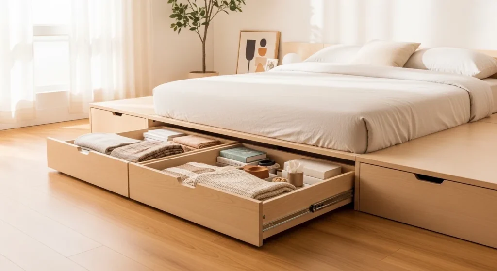Platform beds with built-in storage drawers eliminate the need for separate dresser space. Look for bed frames with 4-6 deep drawers that can accommodate clothing, linens, and personal items. High-quality options range from $400-1200 and typically add 12-16 inches of storage depth under your mattress.