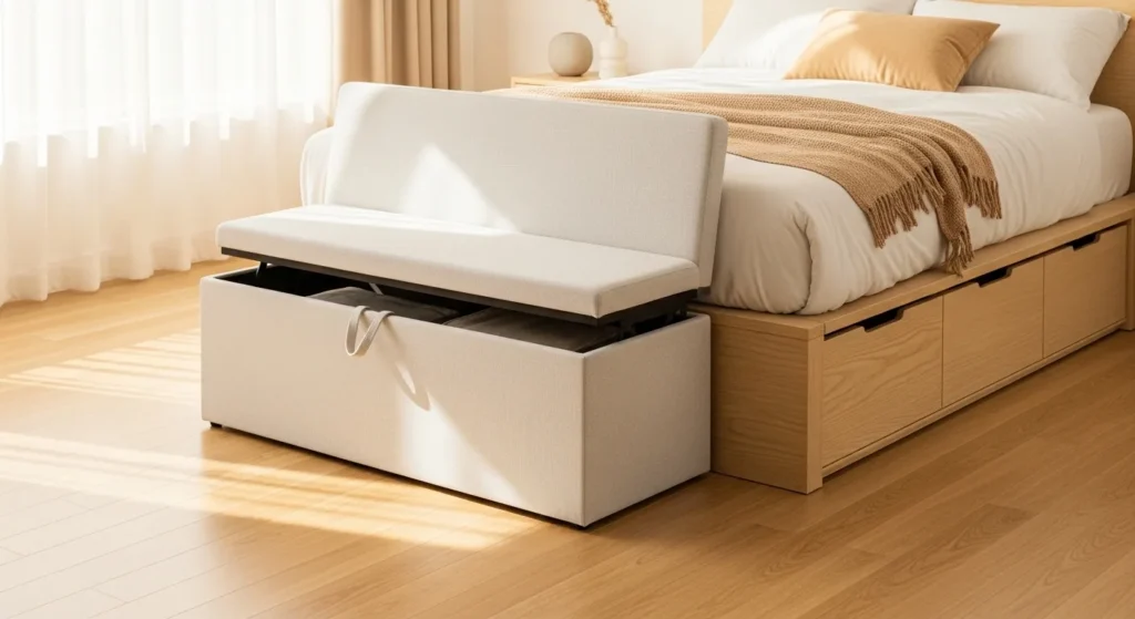 Position a storage ottoman at the foot of your bed to serve as seating, storage, and even a makeshift desk surface. Look for ottomans with dimensions around 36″ x 18″ x 18″ that can hold bedding, clothes, or personal items while supporting up to 250 pounds for seating.