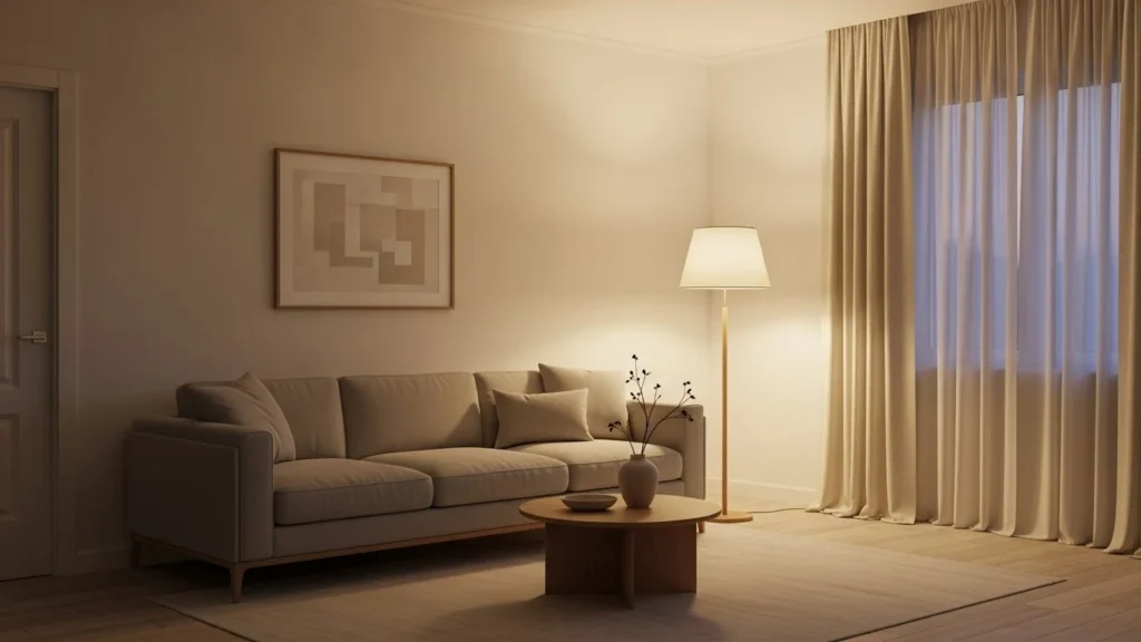 In the evenings, soft ambient lighting — table lamps, floor lamps, wall sconces — warms the room without harsh glare.