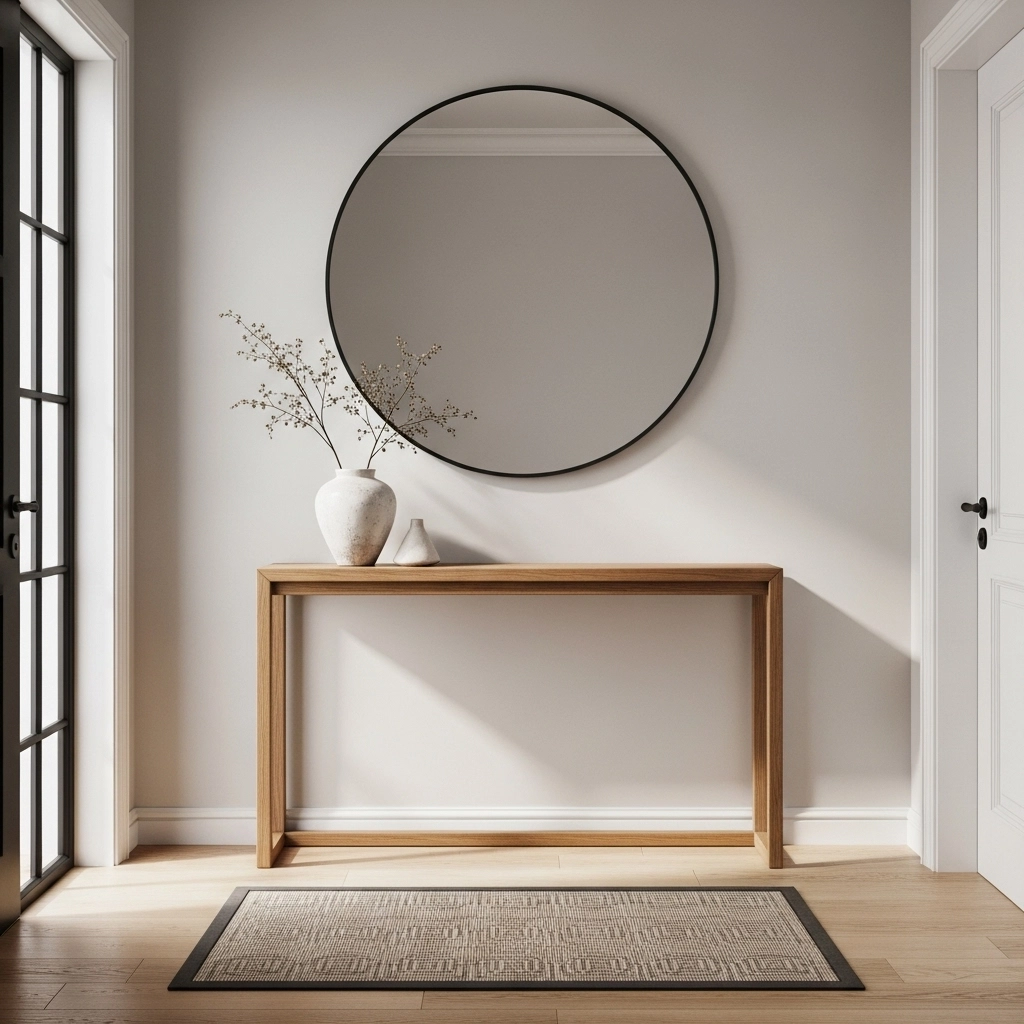 A slim console, a mirror for reflection and light, one or two hooks, and a clean visual line.