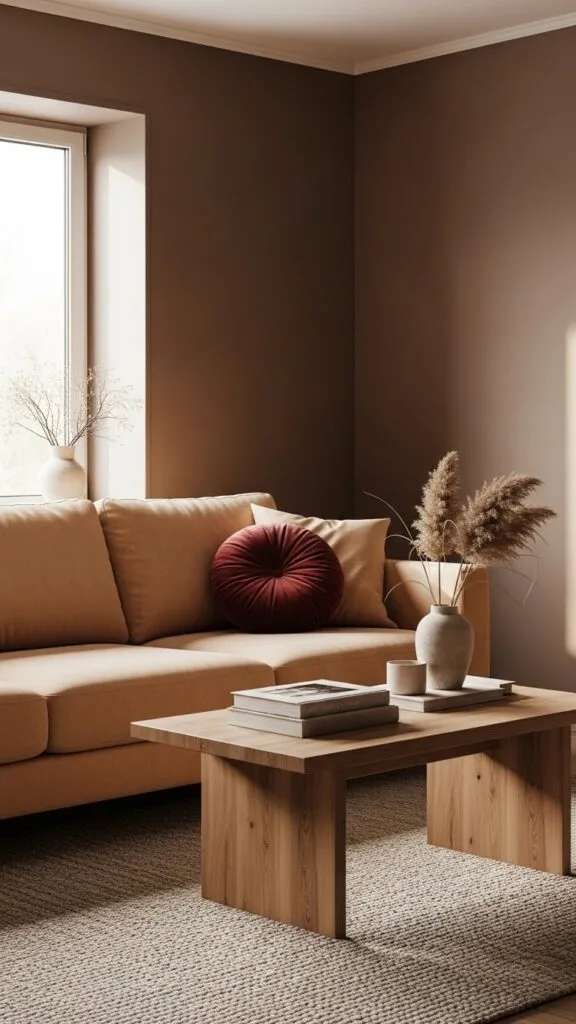 Move past flat greige. 2026 leans into mocha, warm taupe, soft terracotta, and muted burgundy accents — tones that feel grounded rather than dramatic. These shades instantly warm a modern living room without overwhelming it.
