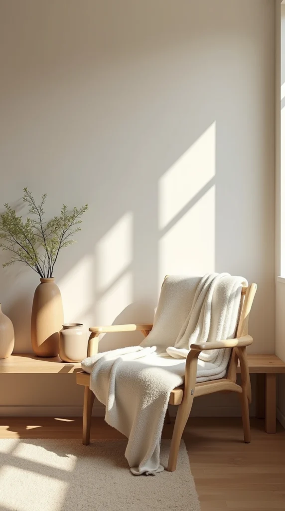 Natural materials — wood, linen, cotton, wool, jute, ceramics. Pair them with soft fabrics and natural light. These elements add depth without overwhelming the room.